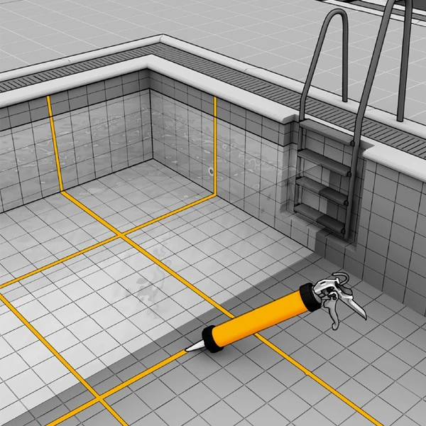 - Joints dans et autour des piscines, zones sous immersion permanente dans l’eau