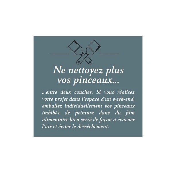 - Oubliez le nettoyage de vos pinceaux entre 2 couches et emballez individuellement vos pinceaux imbibés de peinture dans du film alimentaire bien serré de façon à évacuer l’air et éviter leur dessèchement