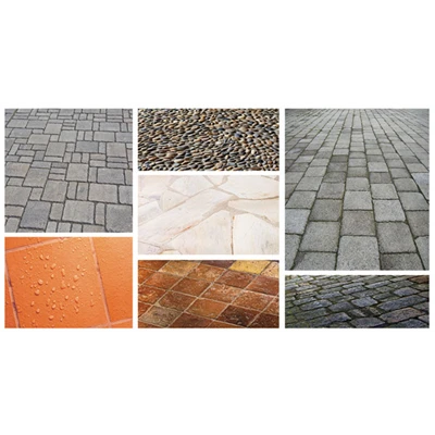 - Dallages et sols extérieurs : pavés autobloquants, pierres naturelles ou reconstituées, bétons bruts ou teintés, terres cuites, tomettes, etc …
